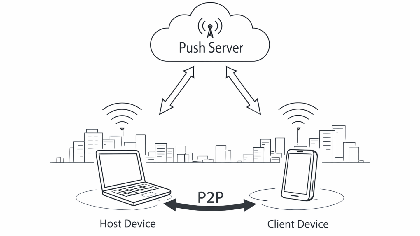 初期接続時と通信情報が変わった時のみPushサーバを利用し、一度通信が確立されれば、あとはホスト端末とクライアント端末が直接データをやり取りするP2P(Peer-to-Peer)方式を採用しています。サーバ側で端末情報を保持し続けない「非集中管理型」の設計により、サーバ負荷や通信のボトルネックを根本から解消。これにより、大量の端末が同時に稼働する環境でも低遅延かつ高いスケーラビリティを確保できます。まさに「サーバは“仲介役”に徹し、通信の主役は端末同士」という、次世代のIoT通信基盤を提供します。