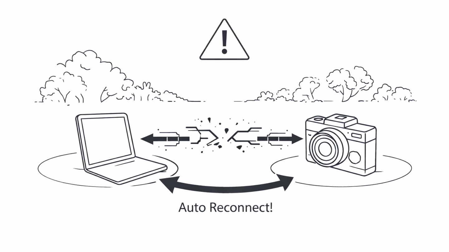 ネットワークの不安定な環境でも安定したサービス提供を可能にするため、端末側で通信切断を即時に検出し、ホスト・クライアントの双方から迅速に再接続を試みる独自のアルゴリズムを搭載しています。IPアドレスやポートが変更された際も即座に経路を再構築できるため、移動体や屋外設置デバイスでも通信断によるサービス停止を最小限に抑えます。サーバがダウンしている状況下でも確立済みの通信を維持できる、「切れても、止まらない通信」という圧倒的な可用性が、ビジネスの継続性を支えます。